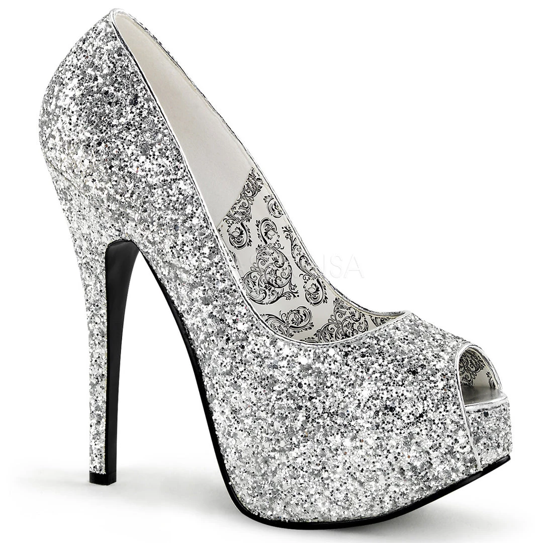 Peep toe platform pumps with a 5 3/4″ stiletto heel, and partially concealed platform.  Available in Hot Pink or Silver Glitter!