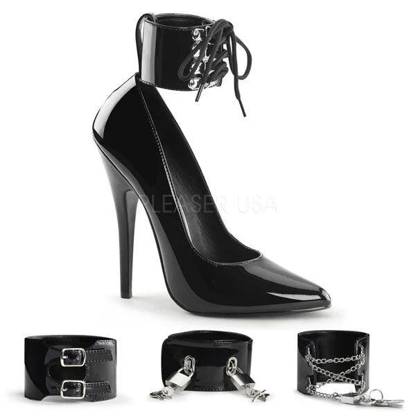 Black patent pumps with pointed toe and 6 inch stiletto heel.  Three looks in one – these sexy heels come complete with three interchangeable ankle cuff straps, with chain, buckles, and padlocks.