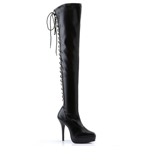 Thigh high platform boots with lace-up back through D-ring loops and full inner side zipper. These boots are made from a semi-stretch material, with a gently pointed toe and 5 1/4″ stiletto heel. Available in shiny Black Patent and Black faux leather.