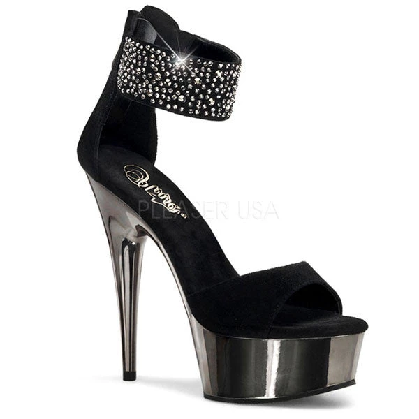 High heel platform sandals with Rhinestone ankle cuff and chromed bottom. These black suede sandals feature a closed back, 6″ stiletto heel, and back zipper.