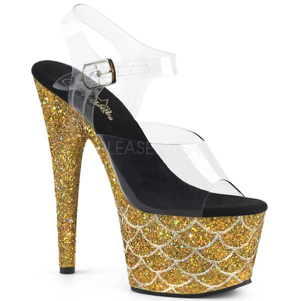 Sexy high heel platform sandals with ankle straps and a holographic glitter bottom. These sandals feature a mermaid scale design, with clear upper, and a 7″ spiked stiletto heel.