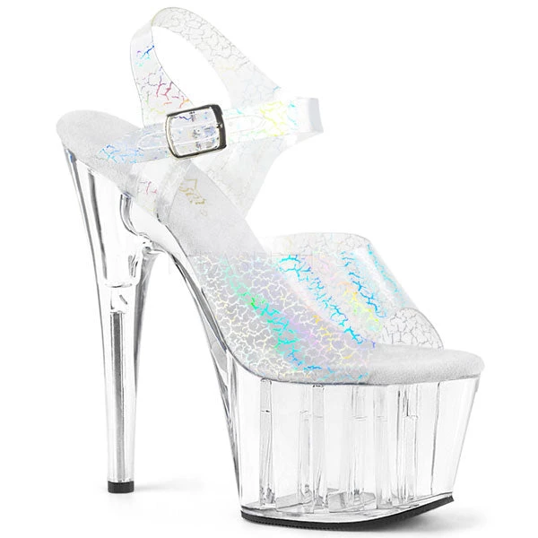 Ankle strap platform heels with a Silver crackle hologram upper and 7″ stiletto heel.Â