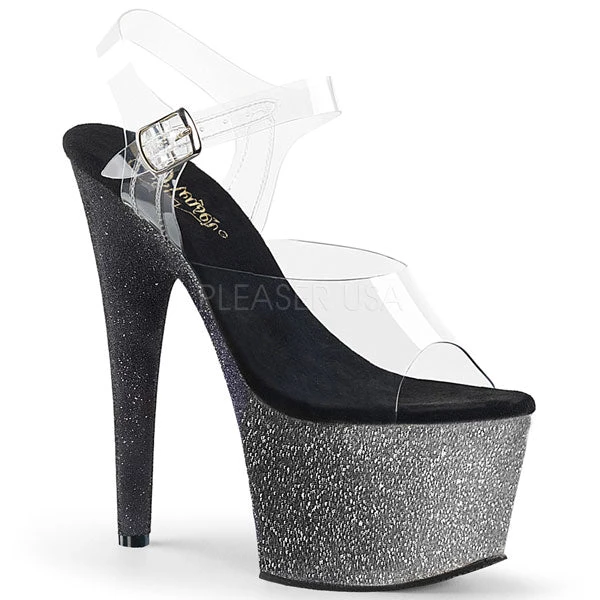 High heel platform sandals with ombre glitter platform heel and clear straps.