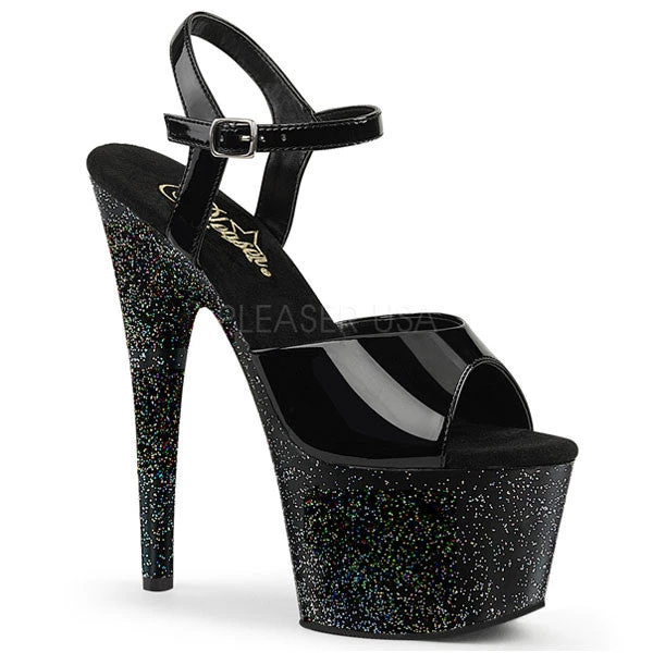 High heel platform sandals with black patent upper and iridescent mini glitter platform heel.