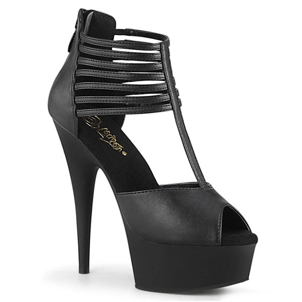 High heel platform pumps with strappy ankle cuff, peep toe, and 6″ stiletto heel. In black vegan leather with closed back and zipper.