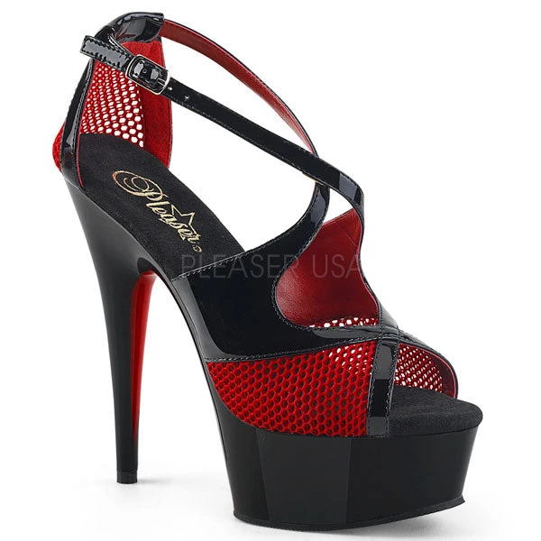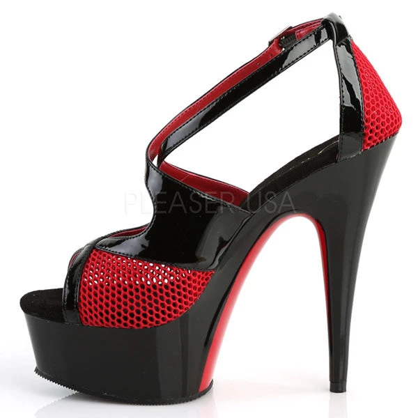 High heel platform sandals with black patent and red fishnet upper, and black with red contrast platform heel. The Delight-652 heels have criss-cross styled straps, with a 6″ spiked stiletto heel.