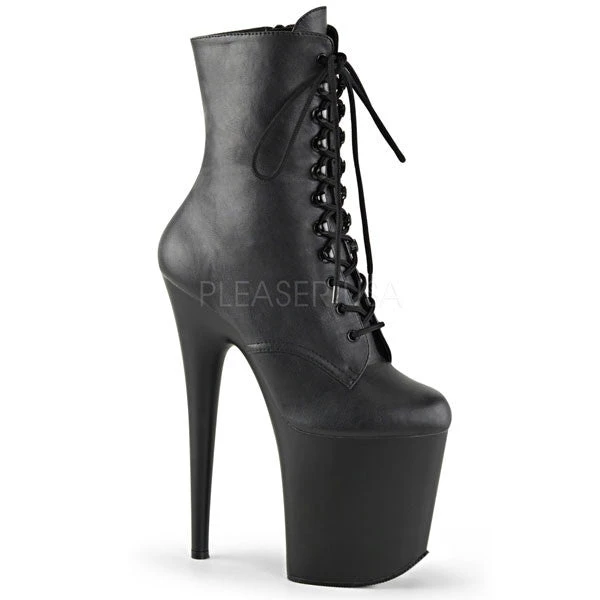 Lace-up ankle boots with 8 inch stiletto heel and front platform. The Flamingo-1020 platform boot by Pleaser features speed-lace hooks for quick lacing and side zipper.