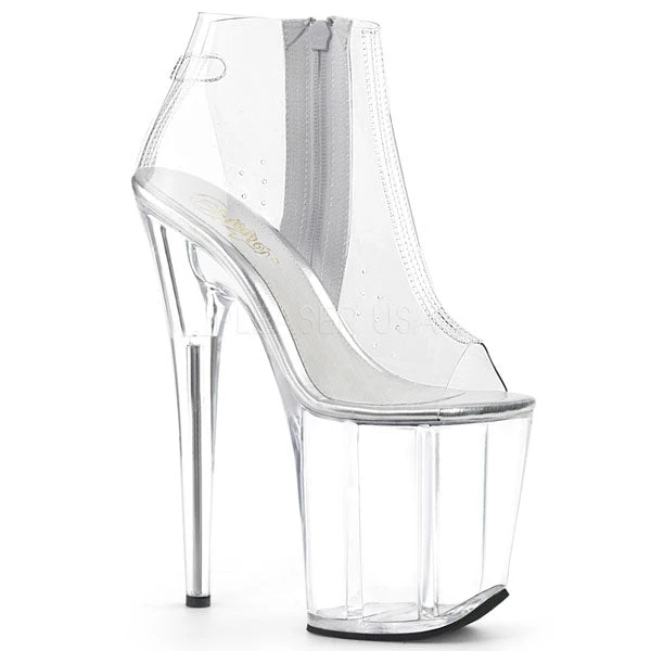 Open toe ankle bootie with clear upper and platform, 8″ stiletto heel, and side zipper.