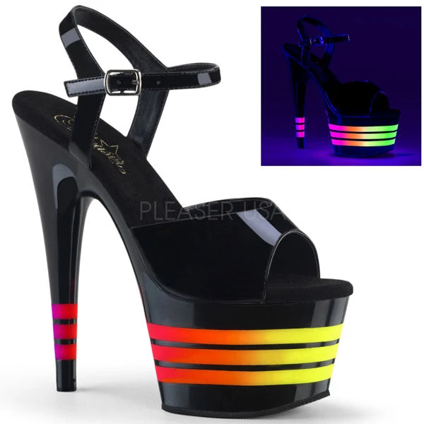 Sexy high heel platform sandals with colorful UV reactive lines which glow under blacklight. These sandals have a black patent upper with 7″ spiked stiletto heel.