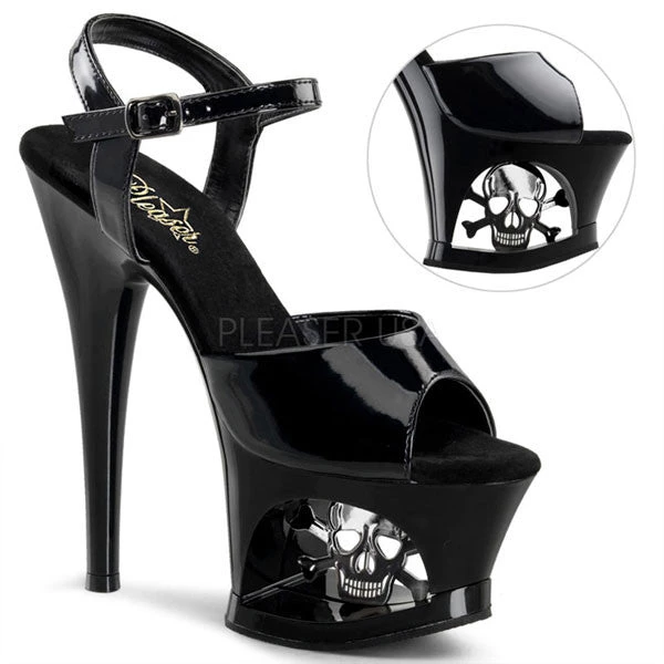 High heel platform sandals with silver skull in the cut-out platform, Black Patent ankle strap upper, and 7 inch stiletto heel.