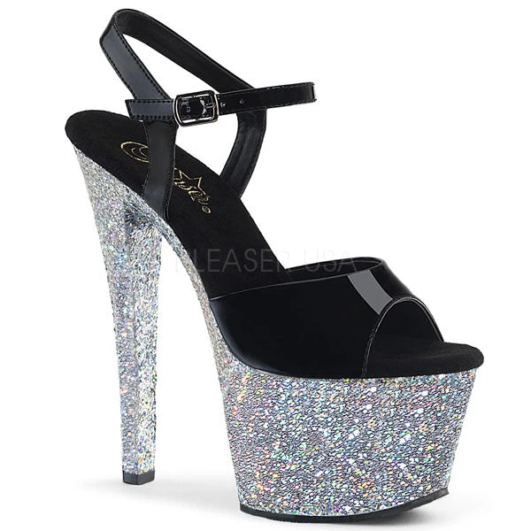 High heel platform sandals with holographic glitter platform heel and black patent straps. The Sky-309LG shoes feature an adjustable buckle closure and 7″ stiletto heel.