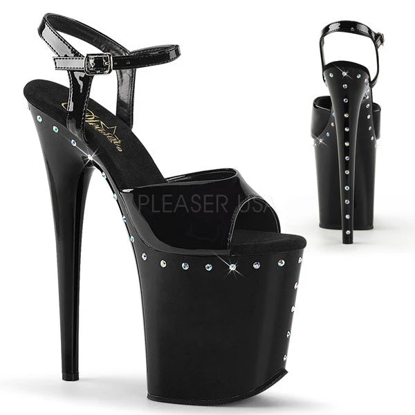 High heel platform sandals with Aurora Borealis Rhinestone accents, black patent upper with adjustable ankle strap, and 8 inch platform heel.