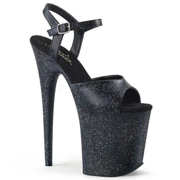 Iridescent mini-glitter platform sandals with an 8 inch platform heel and ankle strap upper.