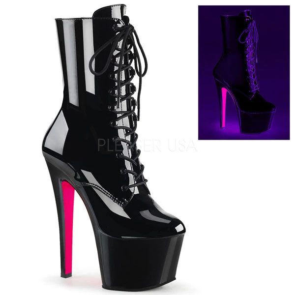 Lace-up ankle boots with a spiked stiletto heel, front platform, and neon pink contrast which glows in blacklight. These boots feature a 7″ heel and side zipper for quick on and off.