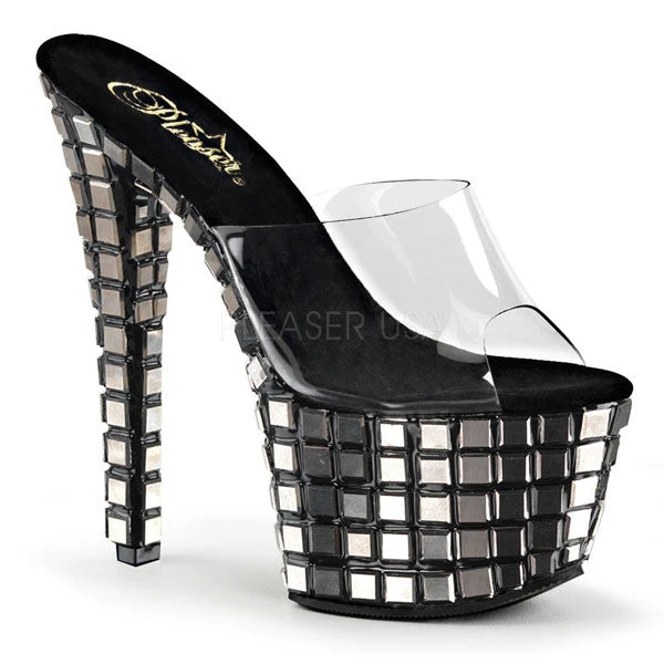 High heel platform slide with mirror-tile covered bottom, clear band across your foot, and 7 inch spiked heel.