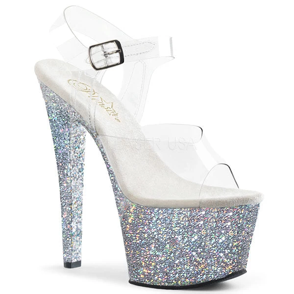 High heel platform sandals with holographic glitter bottom, clear straps, and 7″ stiletto heel.