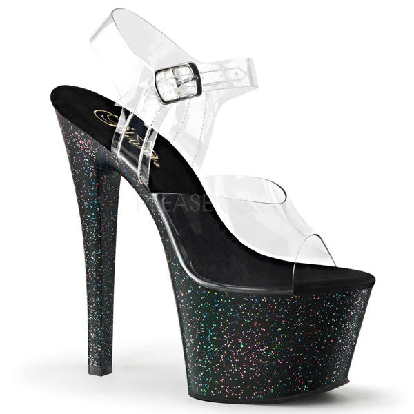 Ankle strap platform heels with shimmering iridescent mini-glitter covered bottom, clear upper, and 7″ stiletto heel.  Available with Black or Silver glitter.
