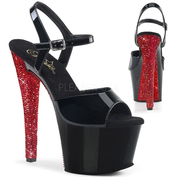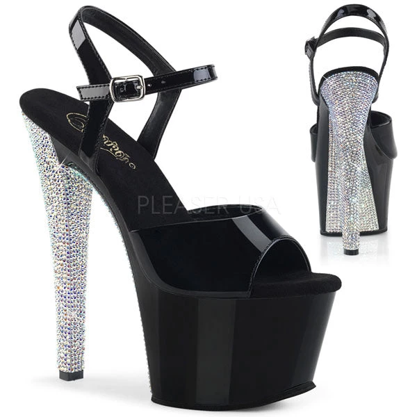 High heel platform sandals with black patent straps and Rhinestone contrast heel. These sandals have ankle strap styling, a padded foot-bed, and 7″ spiked stiletto heel.