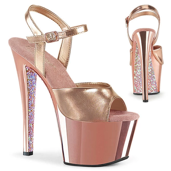 Metallic platform sandals with 7″ stiletto heel and sparkling glitter underside.