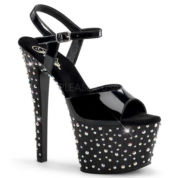 High heel Stardance-709 platform sandals by Pleaser, with multi-sized Rhinestone encrusted bottom, Black patent ankle strap upper, and a 7 inch stiletto heel.