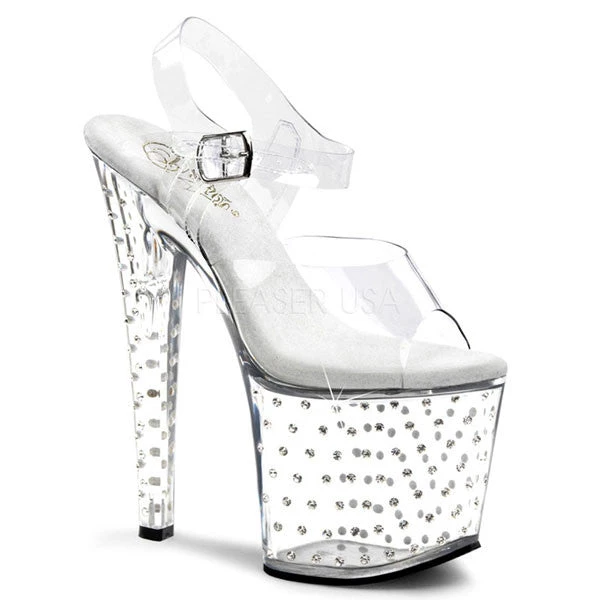 High heel Stardust-758 platform sandals by Pleaser, with Rhinestone studded clear bottom, ankle strap upper, and 7 1/2 inch spiked heel.