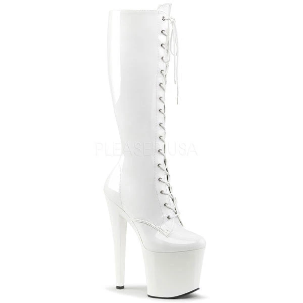 Knee high platform boots with lace-up front and 7 1/2 inch heels.