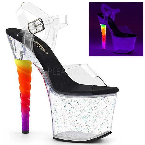 High heel platform sandals with a neon unicorn rainbow heel. The Unicorn-708MG heels feature a clear upper with adjustable ankle straps, and clear iridescent glitter platform bottom.